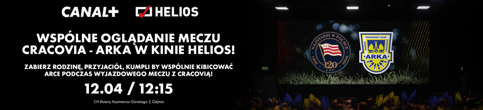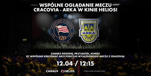 W najbliższą niedzielę (12 kwietnia) o godz. 12:15 w gdyńskim kinie Helios (Centrum Handlowe Riviera, ul. Kazimierza Górskiego 2) będzie możliwość zobaczenia transmisji ze spotkania 28. kolejki PKO Bank Polski Ekstraklasy: Cracovia – Arka Gdynia z innymi fanami „Żółto-Niebieskich” w sali kinowej!
